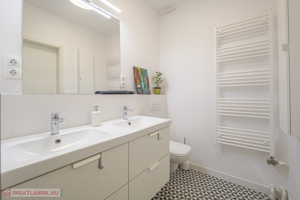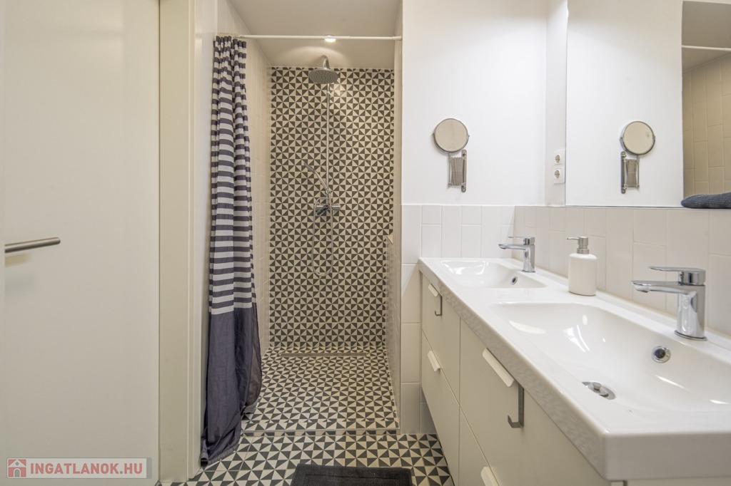 A fürdőszoba zuhanyzós, duplacsappal szerelt, valamint a külön WC mellett itt is található WC.
